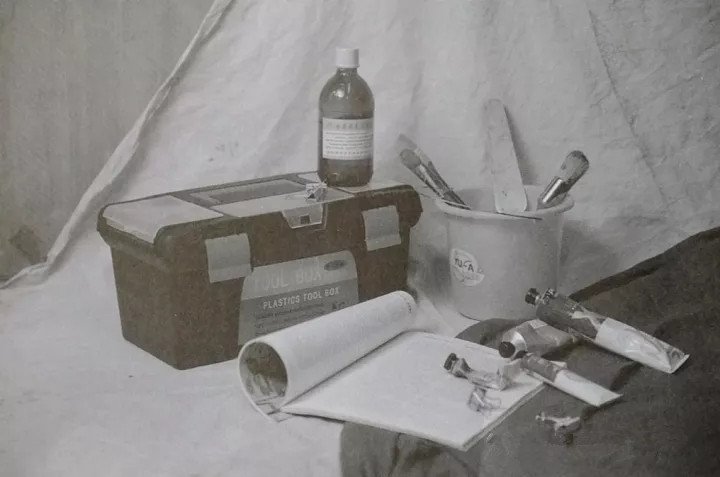 绘画工具箱一个,调色油一瓶、水桶一个、油画笔三支、油画刀一把、颜料四支、小钢夹四个、书一本、不同颜色的衬布两张。