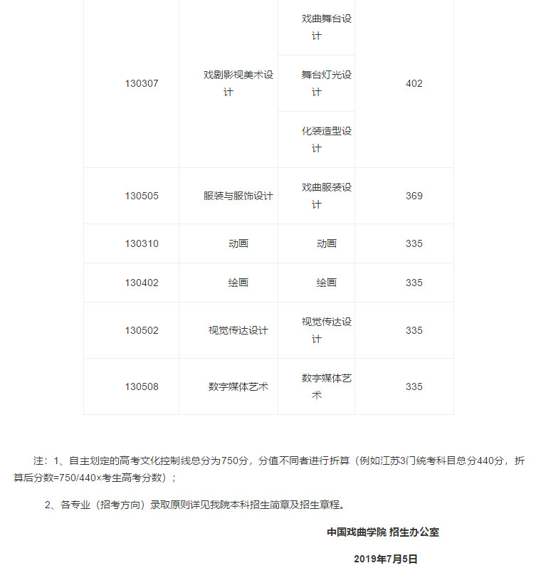 中国戏曲学院2019年本科招生各专业文化控制分数线
