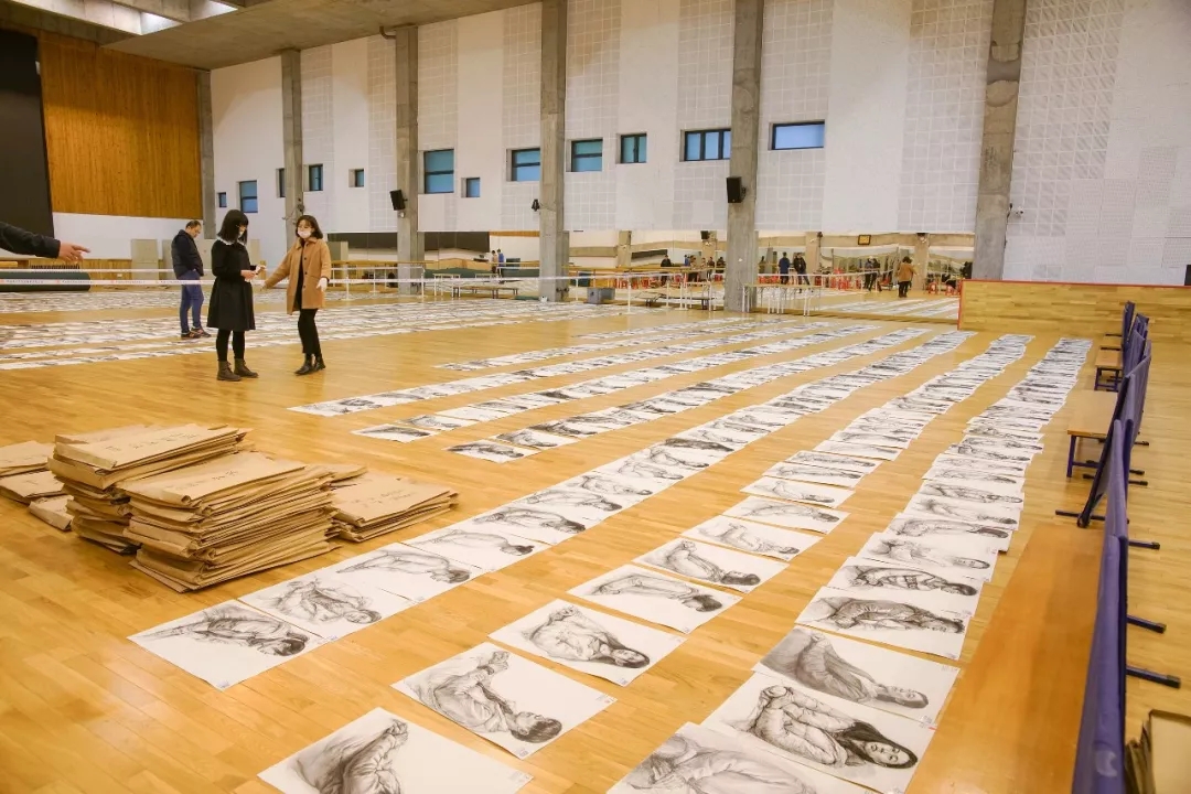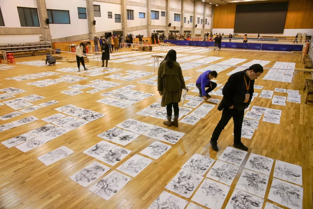 现场一位阅卷老师向我们透露,每年参加阅卷,微信步数每天平均两万步以上,这意味着在体育馆里铺的几排画前,基本要来回走十几趟。评卷老师们在画卷间来回走动,手持长竹棍在画卷的海洋里指指戳戳,身旁的志愿者了然的拿起考卷挪了位置。这个位置的变化,意味着这张考卷的“命运”被改变了。当然,这些凝结着考生心血的考卷可绝不是几秒钟内被判定等级的。