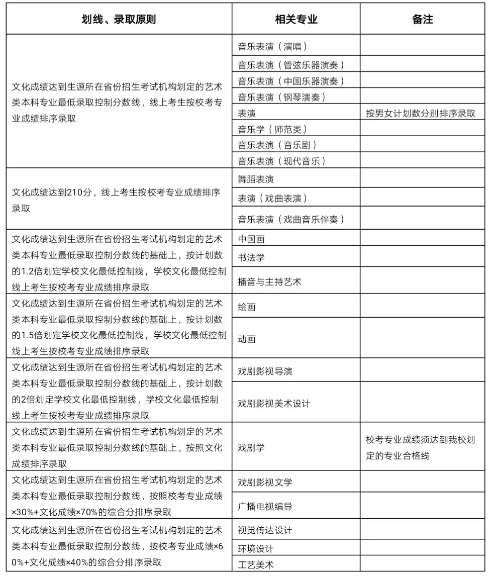 按照教育部有关文件规定,我校为独立设置的本科艺术院校,可自行划定文化录取控制分数线。如有部分省份要求文化录取控制线不得低于当地艺术类最低文化控制线,按各省份文件规定执行。