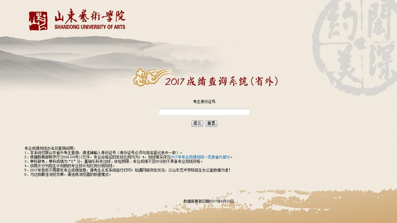 山东省内考生凭省专业准考证号、身份证号登录“2017年校考成绩查询系统(省内)” ,山东省外考生凭身份证号登录 “2017年校考成绩查询系统(省外)”进行专业考试成绩查询。